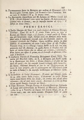 Biblioteca italiana, o sia notizia de' libri rari italiani. Divisa in quattro parti cioè istoria, poesia, prose, arti e scienze / già comp. da Niccola Francesco Haym...Corretta ampliata, e di giudizi intorno alle migliori opere arricchita. Con tavole copiosissime e necessarie.