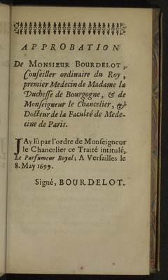 Credit: Le parfumeur royal, ou l'art de parfumer avec les fleurs, etc. Composer toutes sortes de parfums, tant pour l'odeur que pour le gout̂ ... / par le Sieur Barbe, parfumeur. Source: Wellcome Collection.
