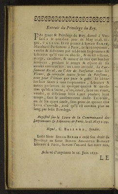 Le parfumeur royal, ou l'art de parfumer avec les fleurs, etc. Composer toutes sortes de parfums, tant pour l'odeur que pour le gout̂ ... / par le Sieur Barbe, parfumeur.